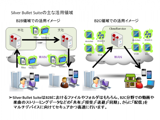 1)Silver Bullet Suiteは独自の高速通信プロトコルSSBPを導入し、他の通信プロトコルと共存しつつ、セキュアかつ高速にデータ伝送する6つのソフトウェア製品で構成されています。