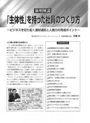 同記事は、いま、継続的な成長を目指す企業の経営者が求めている「主体性」を社員に身につけさせる方法や、「適材適所」の重要性について、また主体性を持った社員が今後、さらにマネージャー・リーダーとして活躍するために必要な「人間力」の育成等ついて、17ページに渡り掲載されたもの。