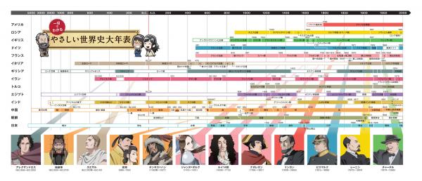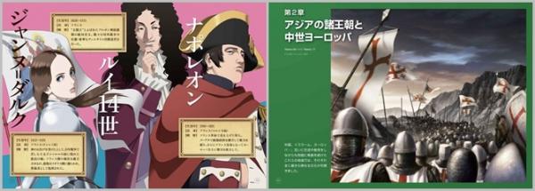巻頭特集『世界史ビジュアル絵巻』では、世界史上の有名人物12人をプロダクション I.Gのアニメーター・西尾鉄也氏がイラスト化! また各章トビラのイラストは、『攻殻機動隊 S.A.C.』シリーズなどのアニメーションの背景を手がける背景スタジオ・株式会社Bambooが担当しています。