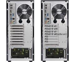 本体前面に設置された14cm吸気ファンは、システム構成に合わせて回転数が3段階に切り替えられる静音ファンを使用しており、システム構成に応じて2台まで増設できます。背面に設置された12cm排気ファンは、システムからの発熱量に応じて回転数がコントロールされるPWM(Pulse Width Modulation)ファンを採用しています。さらに、サイドパネルにも12cm排気ファンを2台まで増設可能です。