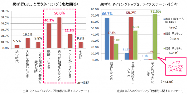 「Q.今までに親孝行をした、と思うタイミングがあればお選びください。(複数回答)」の設問では、最も多かった回答は「自分が結婚をしたとき(50.0%)」となり、以下「就職したとき(40.2%)」「子どもができたとき(22.8%)」という回答が続きました。この3大傾向を、「未婚(婚約中含む)」「既婚(子どもなし)」「既婚(子どもあり)」のステータス別で見てみると、「未婚者」は「就職したとき」、「既婚者(子どもなし)」は「自分が結婚をしたとき」、「既婚者(子どもあり)」は、「子どもができたとき」、をそれぞれトップにあげ、ライフステージによって「親孝行をした」と思うタイミングが異なることがわかりました。