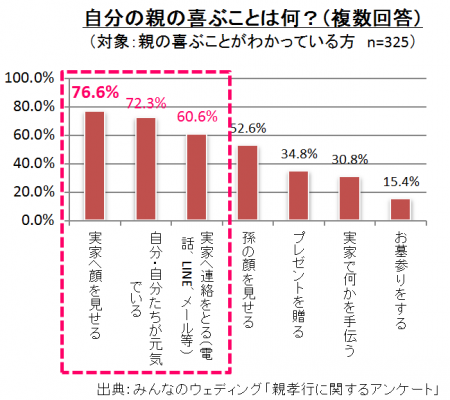 「Q.自分の親の喜ぶことが、わかっている/まぁわかっている方に伺います。それは何ですか?」という設問では、「実家へ顔を見せる(76.6%)」がトップとなり、以下「自分・自分たちが元気でいる(72.3%)」「実家へ連絡(電話、LINE、メール等)をとる(60.6%)」が続く結果となりました。