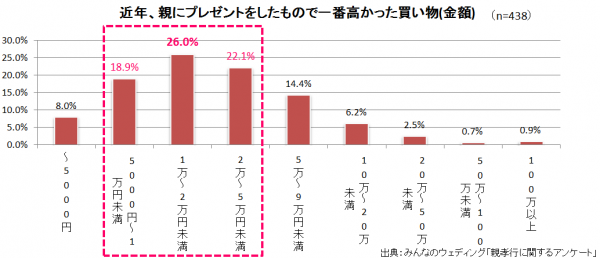 「Q.近年、親にプレゼントをしたもので、一番高かった買い物の金額を教えてください。」という設問では、「1万~2万円未満(26.0%)」とトップとなり、以下「2万~5万円(22.1%)」「5,000円~1万円未満(18.9%)」が続く結果となりました。