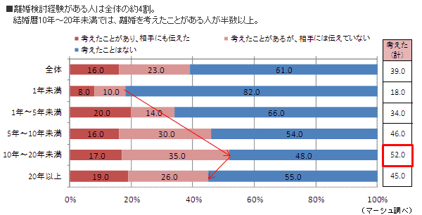 そこで、既婚者・男女を対象に、離婚に対しての意識を調査したところ、それぞれ離婚に抵抗がない人は全体の3割、実際に離婚を考えたことがある人は4割、離婚の可能性がないと言い切れない人は約半数に達するという結果になりました。
