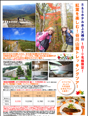 秋の「みなかみ」を楽しむなら“谷川岳の紅葉”ははずせません。本格的な登山はちょっと…、という方も手軽に谷川岳と紅葉狩りが楽しめます。トレッキングの指導と案内は、山が大好きな地元の愉快なガイドクラブ「カッパCLUB」が担当してくれます。