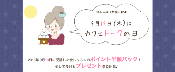 受講生だけではなく講師からも注目を集める、毎月恒例のカフェトークの日。受講したレッスン料が半額返却される、半額ポイントバック・サービスデーが、2013年9月も19日に開催されます。この日はレッスンの準備とスケジュールを万全に整えた、多くの講師達がレッスンをお待ちしています!