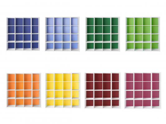 ・正方形(縦横 380mm)の基本ユニット縦2段・縦4段に対し、横に1列ずつ増設できるオープンラックです。1列ごとに異なる 背板カラーを設定できるので、配色レイアウトも自由自在。また、縦4段は最大縦5段に増設可能です。