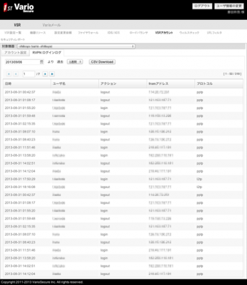 この度、バリオセキュアでは、マネージドセキュリティサービスで提供される管理者用コントロールパネルに対し、リモートVPNのログインログ管理画面を追加し、過去3カ月間のログイン情報の表示とCSVファイルによるログのダウンロード対応を可能にしました。今回の機能追加により、各ユーザのログイン時刻やfromアドレス、プロトコル等の把握が可能となり、リモートVPNの運用、管理を行う上での有益な情報としてお役立て頂けるものとなります。