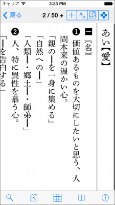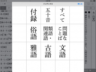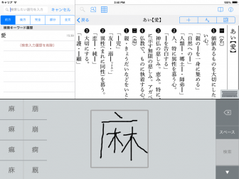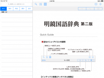 LogoVista電子辞典で培った検索方法を継承。前方一致/後方一致/完全一致/部分一致/全文検索といった豊富な検索オプションを利用できます。また文字を入力すると候補見出し語が表示され、うろ覚えでも検索できるインクリメンタルサーチや、検索結果に表示された本文中の用語をなぞることでそのまま連続辞書引きも可能。思考を妨げることなく次々と検索できるのが特長です。マルチタッチによる拡大やセンサーによる画面の回転にも対応しています。
