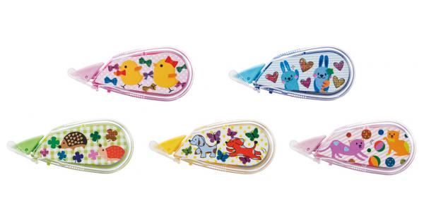 どちらも使いきりサイズで、カラーはそれぞれピンク、ブルー、グリーン、イエロー、ベビーピンクの5色。メーカー希望小売価格(税込)は、従来品と同一価格設定で、修正テープ「ホワイパープチ」が210円、テープのり「ノリノ ビーンズ」189円です。