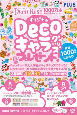 プラス株式会社(本社:東京都港区 代表取締役社長:今泉公二)は、Deco Rush 1000万本突破記念キャンペーン「オリジナルDECOキャラグッズプレゼント!」を2013年10月10日から全国で実施します。