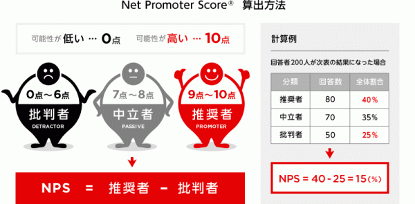 最初に、顧客に対して「あなたが×××(企業やブランド名)を友人や同僚にすすめる可能性はどのくらいありますか?」 という質問を投げかけ、その回答を 0点(おすすめしない)~10点(おすすめする)の11段階で答えてもらいます。10~9点の集団を「推奨者(Promoter)」、8~7点の集団を「中立者(Passive)」、6点~0点の集団を「批判者(Detractor)」と定義します。そして、全体に占める推奨者の割合から批判者の割合を引いた数値がNPSです。