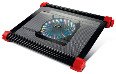 CP007は、17インチの大型サイズに対応したノートパソコンクーラーです。高剛性アルミニウムフレームとスチールメッシュを採用しています。背面に取り付ける180mm VEGASファンはマグネットマウントに対応、デザインやサイズ、ホットスポットの異なるノートパソコンも効果的に冷却可能です。独自のファン形状、Turbine&Focus Blades採用により、ノートパソコンの熱を素早く冷却します。合計24個のLEDを搭載、3つの発光パターンとLED OFF、特許を取得したCircular type LEDが美しい発光を演出します。
