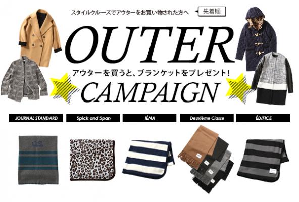 株式会社ベイクルーズ(東京都渋谷区、代表:窪田祐)は、ファッション通販サイト「Style Cruise|スタイルクルーズ」にて、2013年10月1日(火)より、アウターキャンペーンを開催いたします。キャンペーン期間中、スタイルクルーズで対象アウターをお買い上げいただいたお客さまに、先着でJOURNAL STANDARD、IENA、EDIFICE、Spick and Span、Deuxieme Classeのオリジナルブランケットをプレゼントいたします。