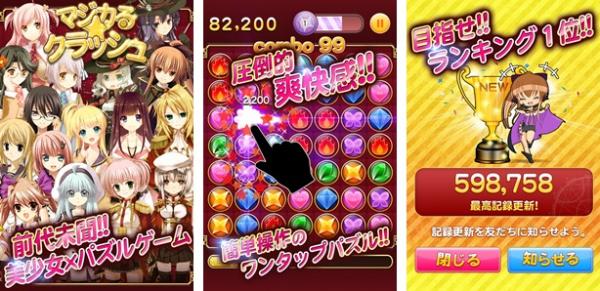 『マジカる◆クラッシュ』は、現在までで約95万人のユーザーにご利用いただいている恋愛ゲーム『マジカ★マジカ』に登場する美少女キャラクター16人の応援を受けながら、画面内の同じ色のストーンを3個並べて消していく形式の3マッチパズルゲームです。簡単な操作で大連鎖の爽快感が味わえ、『マジカ★マジカ』をプレーしたことがないユーザーでも手軽にお楽しみいただけます。