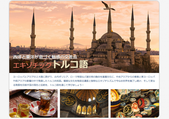 複雑な文化を物語る遺産と独特なエキゾチシズムで世界を魅了し続け、今やヨーロッパ圏とアジア圏両舞台へ活躍の場を広げる国トルコの現在と伝統を、「トルコ語」を通じて学びましょう!