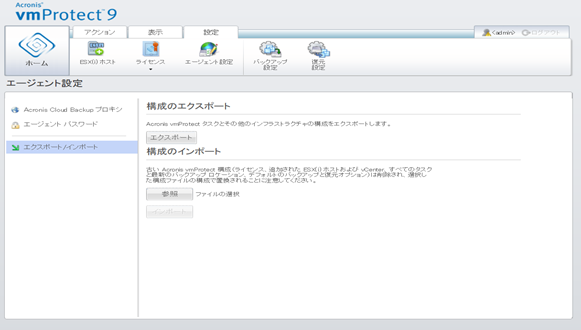 Acronis vmProtect 9 エージェントの構成ファイルのエクスポートとインポートが可能となりました。