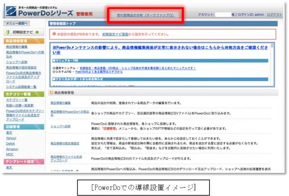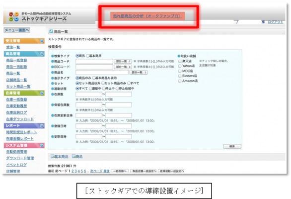 この「サバスタ」の各管理ページ(「ストックギア」、「PowerDO」、「MDC」)内から、2013年10月1日より、当社サービスの「オークファンプロ」へのユーザ誘導を開始いたしました。これにより、「サバスタ」利用者は「オークファンプロ」へ直接アクセスし、売れ筋商品の分析など、出品予定商品のチェックが可能になりました。