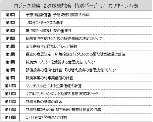 ロジック財務 2次試験対策 特別バージョンの特徴とカリキュラムは以下の通りです。