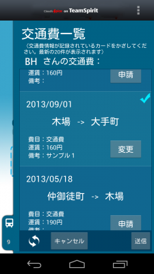 さらに、交通カードの交通費情報を『チームスピリット』に連携することも可能です。従来この機能の利用は、PCに接続したリーダーにタッチし、PCからのみデータの受け渡しが可能でした。今回は新機能として、Android端末用のアプリケーションを新たに提供します。これを利用することで、モバイル端末だけで交通費情報を選択し『チームスピリット』に簡単に送ることができるようになります。PCなどを設置できないような環境など、どんなところからでも交通費精算が可能となり、外出先から交通費精算のためにPCの設置してあるオフィスに戻る必要もなくなり、従業員の利便性は大きく向上します。