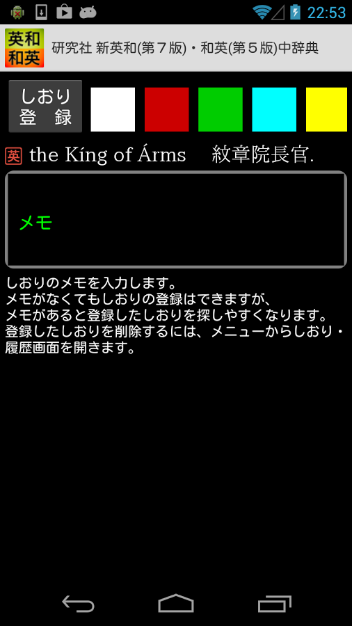 ●メモ登録可能なしおり、履歴といった基本機能を、ソートや、辞典ごとに切り替えることにより、過去の項目を素早く探すことが可能。