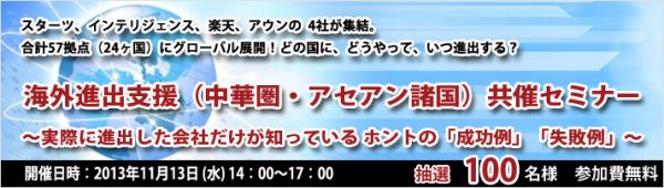 11月13日(水)、海外進出に興味がある企業様、または海外進出検討中の企業様を対象に、「海外進出支援(中華圏・アセアン諸国)共催セミナー」~実際に進出した会社だけが知っている ホントの「成功例」「失敗例」~を東京にて開催いたします。