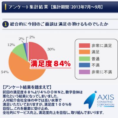 ■前回の満足度88%(2013年4月~6月)より4%DOWNと、数字自体は悪化という結果になってしまいました。人材紹介会社全体の中では高い水準で満足いただいておりますが、満足度100%を目指し、これを厳粛に受け止め、全社的にサービス向上、満足度向上を目指し、取り組んでまいります。