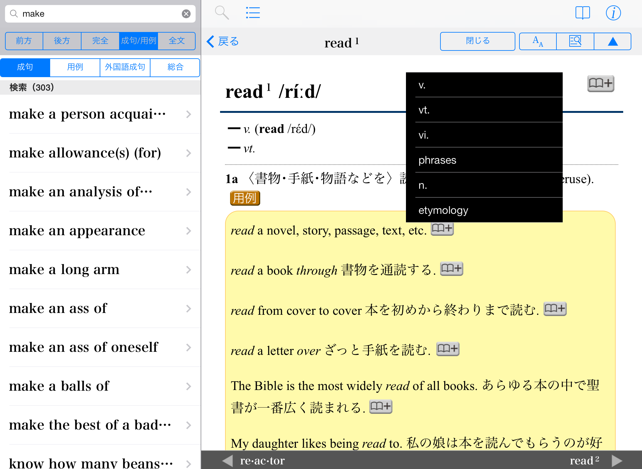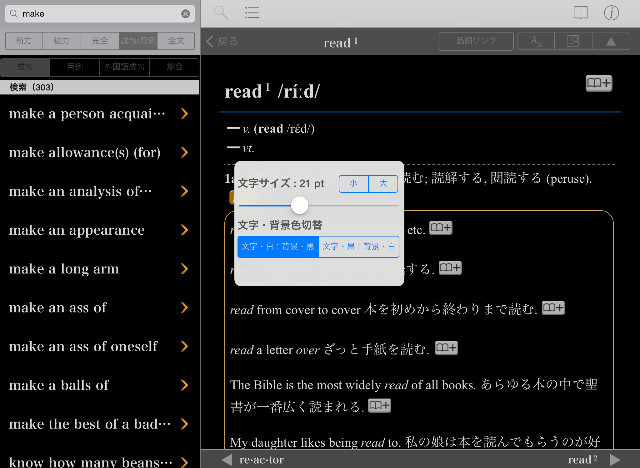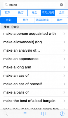 ●豊富な検索オプションを用意(前方一致/後方一致/成句検索/用例検索/総合検索/外国語成句検索/全文検索)それぞれの検索方法でインクリメンタルサーチに対応(全文検索を除く)
