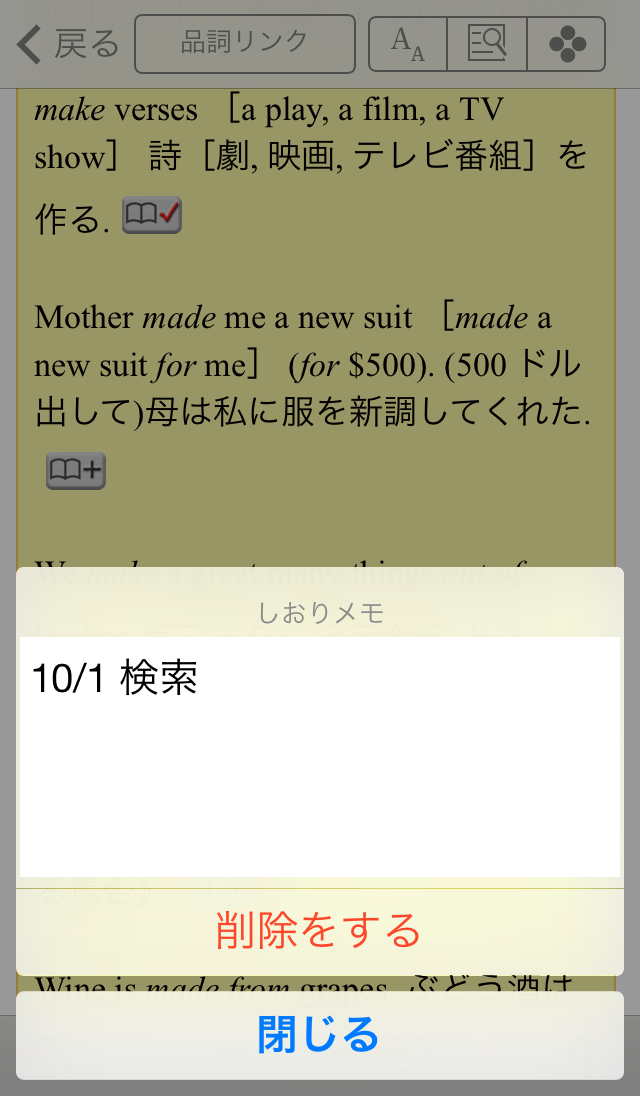 ●連続する辞書引きに役立つ履歴表示(閲覧日も表示)、しおり(メモ機能付き)、検索キーワード履歴など。
