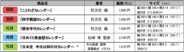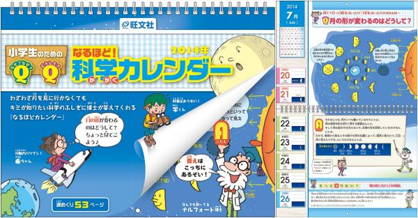 2014年版では、身近な科学の疑問をイラストでわかりやすく解説した新作『小学生のためのなるほど!科学カレンダー』など、楽しみながら学べるカレンダー4教科全9点を取りそろえました。