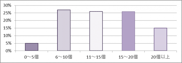 かろうじて6~10個が最も多くなりました。次いで、11~15個、15~20個とほぼ同数で約25%ずつ、合計約75%が分散する結果となりました。
