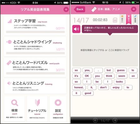「日本語でよく聞く、よく言う表現を英語に直したらどうなる?」といった疑問を解消できる2,800もの英会話表現の他に、音声認識機能を使ったシャドーイング自動採点システムなど、アプリならではの学習機能によって、移動中や外出先などのちょっとした時間に、お手軽に学習をすすめることができます。