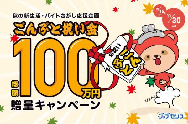 株式会社リブセンス(本社:東京都品川区、代表取締役社長:村上太一、東証一部:6054)は、アルバイト求人サイト「ジョブセンス」(URL http://j-sen.jp/)において、秋の新生活・バイト探し応援企画「ごんぶと祝い金総額100万円贈呈キャンペーン」を実施することをお知らせいたします。