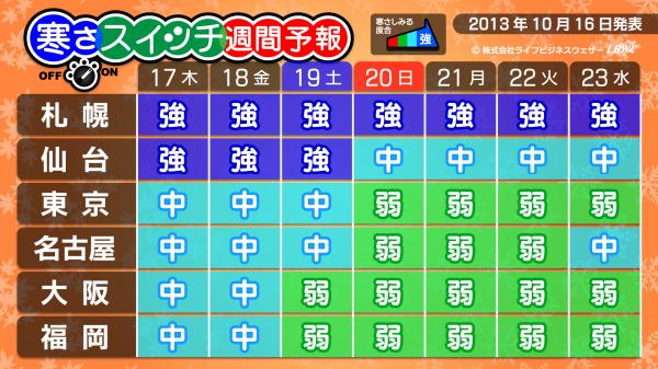 『寒さスイッチ予報』とは・・・この先一週間は寒く感じるのかどうか、一日の気温だけではなく、風や湿度、前日や平年との気温差などを考慮したLBW独自のアルゴリズムをもとに発表している予報で、秋から冬にかけての皆様の生活を強力サポートします。