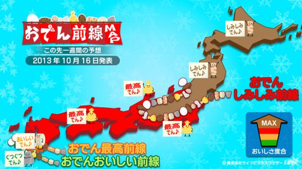 『おでん前線』とは・・・体感気温などの要素からLBW独自のアルゴリズムから導きだした「おでんの食べ頃」を伝える予報。「食べるなら今でしょ!」というタイミングがわかります。