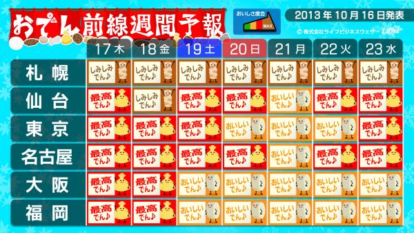 台風26号の通過後は、秋の空気がグッと流れ込み、季節の進みが一層進む。この先一週間は、北海道だけでなく本州中部内陸部まで「おでんしみしみ前線」が南下しそう。九州南部の一部を除いて食べ頃を迎え日本列島はおでん今でしょ列島に。ボリュームある具材を多用してしみしみおでんを楽しみましょう。