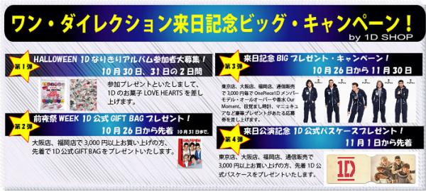 今世界中で大旋風を巻き起こしている、ワン・ダイレクションがいよいよ上陸直前! 11月2、3日に初来日公演(幕張メッセ)が行われ、来日公演前の11月1日より3DMOVIE「1D3D」も日本全国上映。彼らの来日を記念して、ONE DIRECTION公式グッズSHOP「1D SHOP」東京店、大阪店、福岡店、通信販売では、 10月26日から11月31日まで来日記念ビッグ・キャンペーンを実施いたします。