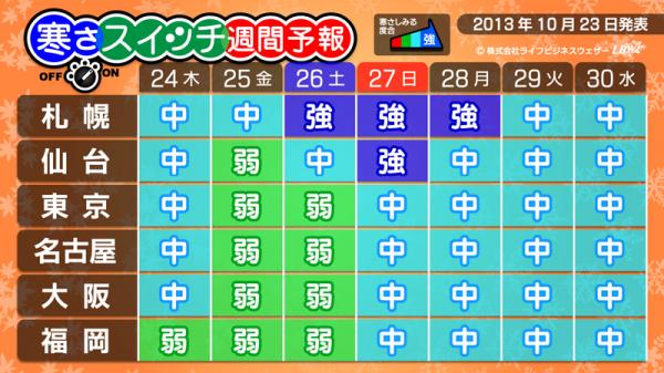 『寒さスイッチ予報』とは・・・この先一週間は寒く感じるのかどうか、一日の気温だけではなく、風や湿度、前日や平年との気温差などを考慮したLBW独自のアルゴリズムをもとに発表している予報