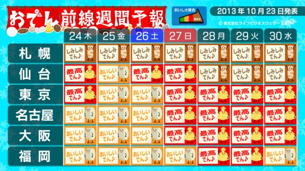 『おでん前線』とは・・・体感気温などの要素からLBW独自のアルゴリズムから導きだした「おでんの食べ頃」を伝える予報。「食べるなら今でしょ!」というタイミングがわかります。