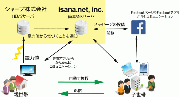 イサナドットネットは、シャープ株式会社と共同でHEMSとテレビ、そして、SNS(Facebook)に連携した独り暮らしの高齢者を見守るアプリを開発しました。子世帯と親世帯(独り暮らしの高齢者)が毎日、簡単にコミュニケーションを取れるようにすることで、子世帯が自然な形で親世帯を見守る事を可能にします。 本アプリは、大手家電メーカーや東京電力株式会社が企画したHEMS道場の活動から生まれたものです。イサナドットネットでは、HEMSや、家電と連携したスマートフォンアプリの開発・研究を行なっており、今回の取り組みもその一環となります。