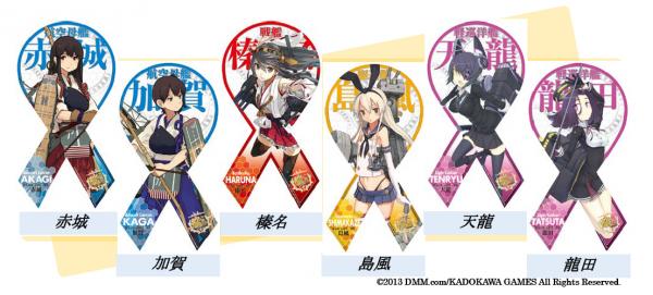 第1弾ラインナップは「赤城」「加賀」「榛名」「島風」「天龍」「龍田」の全6種。リボン型に艦娘&艦船名が存在感たっぷりにデザインされた、提督必携のアイテムとなっています。愛車や冷蔵庫に貼って、艦娘の帰還を祈りましょう!