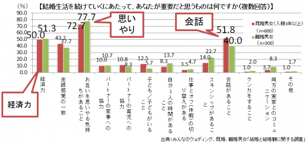 「Q.結婚生活を続けていくにあたって、あなたが重要だと思うものは何ですか。あてはまるものを最大3つまでお選びください。」の設問では、既婚者が、1位「お互いを思いやる気持ちがあること(74.3%)」、2位「会話があること(51.8%)」、3位「経済力(50.0%)」という結果となったのに対し、離婚者は、1位「お互いを思いやる気持ちがあること(77.3%)」、2位」 「経済力(51.3%)」 、3位「会話があること(40.0%)」という結果となり、離婚者に比べ、既婚者のほうが「会話があること」を重要視している傾向が見受けられました。