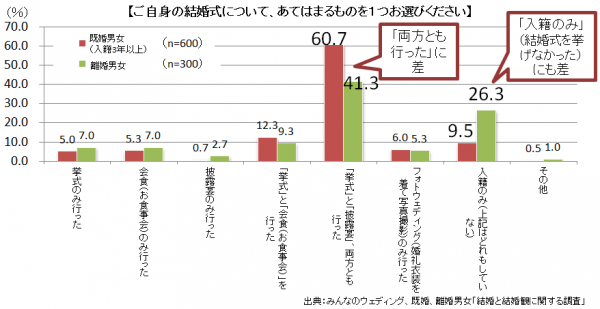 「Q. ご自身の結婚式について、あてはまるものを1つお選びください。※なお、実施した場所は国内、海外を問いません。」の設問では、「両方とも行った」と答えた既婚者(60.7%)、離婚者(41.3%)の差が19.4%差と最も大きく、次いで「入籍のみ(結婚式を挙げなかった)」と答えた既婚者(9.5%)、離婚者(26.3%)の差が16.8%差と大きくなりました。