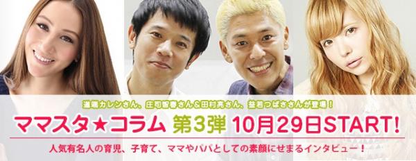 本日より、お笑いタレントの田村亮さん、庄司智春さんが妻や家族への愛について語る大型インタビュー企画『ママスタ☆コラム』の第三弾を開始いたします。さらに、モデルや歌手として活躍される益若つばささん、自らモデルとして活動されるだけでなく、様々な美容メソッドについても造詣が深い道端カレンさんにご登場いただき、合計24本のインタビュー記事が連載されます。