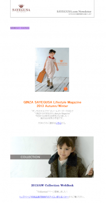 インターネットを活用したマーケティングソリューションを提案する株式会社エイジア(本社:東京都品川区、代表取締役:美濃 和男、以下 当社)は、子供服の企画・販売を行う株式会社ギンザのサヱグサ(本社:東京都中央区、代表者:三枝 亮、以下 ギンザのサヱグサ)様に提供したメール配信システム「WEBCAS e-mail」の導入事例インタビューを、本日公開いたしました。来年創業145年目を迎える同社は、お客様とのつながりをより深めるため、WEBCASで訴求力の高いHTMLメールを配信されています。