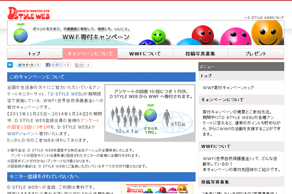 本キャンペーンでは、D STYLE WEBが実施するアンケートへの会員の回答10回につき1円を、D STYLE WEBがWWFジャパンに寄付いたします。キャンペーン実施期間は2013年10月25日~2014年1月24日まで。