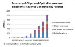 米国調査会社CIR社の調査レポート「光インターコネクト市場と技術予測 2012-2020年:第2巻 オンチップとチップトゥチップ - Revenue Opportunities for Optical Interconnects: Market and Technology Forecast - 2013 to 2020 Vol II: On-Chip and Chip-to-Chip」は、チップレベルの光インターコネクト市場は数十億の出荷数と収益が見込まれ、実現可能市場は2019年の5億2000万ドルから2021年には10億2000万ドルに達するだろうと予測している。この調査レポートは、2009年の調査レポートの更新版である。