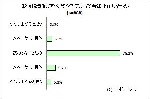 全国の男女20歳以上の就業者に「就業者に聞いた!アベノミクス意識調査」についてスマートフォンでアンケートしたところ、「給料はアベノミクスによって今後上がりそうか」という質問に対し、全体1位「変わらないと思う」(78.2%)であった(図3)。「かなり上がると思う」(0.8%)と「やや上がると思う」(6.2%)の合計よりも、「やや下がると思う」(9.7%)と「かなり下がると思う」(5.2%)の合計が7.9ポイント高く、ネガティブなイメージが若干多かった。