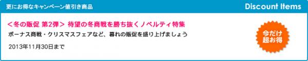 販促ノベルティ卸売りセンターでは、通常の卸売価格よりも更にお得な!値引きキャンペーンを期間限定で開催いたします。是非、お得なこの機会に名入れノベルティをご検討ください。お得な値引き期間は、2013年11月30日まで。