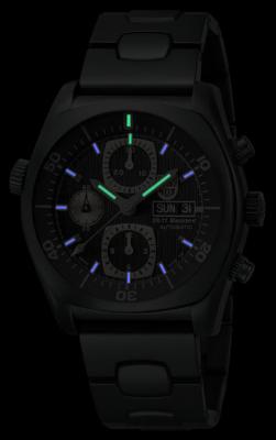 文字盤上には、曜日と日付を示すディスプレイが3時側に、中央にはスクエア型のクロノグラフが、そして12時側と6時側には分針、時針のカウンターが配置されています。ルミノックスすべての時計に搭載されている自己発光システムルミノックス・ライト・テクノロジー(LLT)も搭載。色はオールブラックで仕上げており、ルミノックスでも定評のブラックアウトということで2色でまとめブラックを強調してあります。